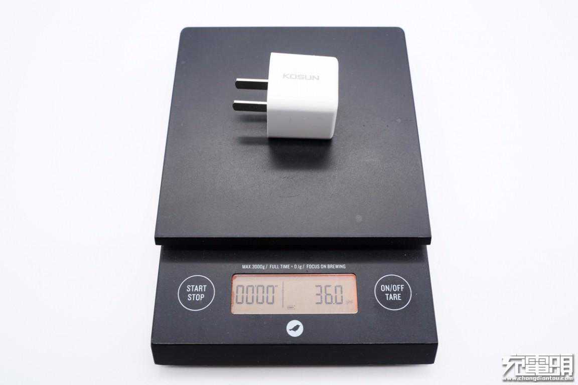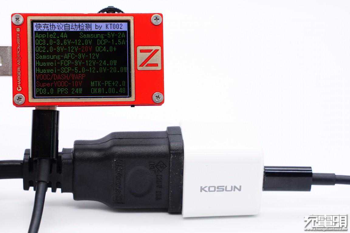 充电器采用PC阻燃材质白色外壳,表面钢琴烤漆处理,边角过渡圆润,整体十分光滑且设计简洁,腰身上印有KOSUN品牌。