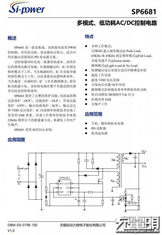 无锡硅动力SP6681是一款高集成、高性能电流型PWM控制器,具有低功耗、宽电源电压特点,适合应用在输出范围宽的PD充电器方案。该控制器同时也是一款兼容低成本、高性价比的离线反激式电路,该控制电路在整个负载范围内都有比较高的转换效率。