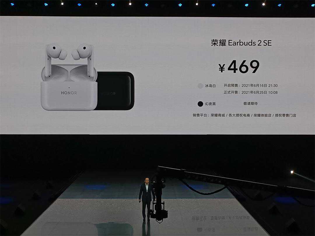 发布会还带来了荣耀配件产品——荣耀EarBuds2SE真无线降噪耳机。其拥有主动降噪和透传降噪两种模式,适配荣耀50系列手机开盖秒连。内置10mm动圈单元。续航方面,其关闭主动降噪下可连续播放10小时音乐,搭配充电盒连续充电综合续航可达到32小时,同样在6月25日开售。