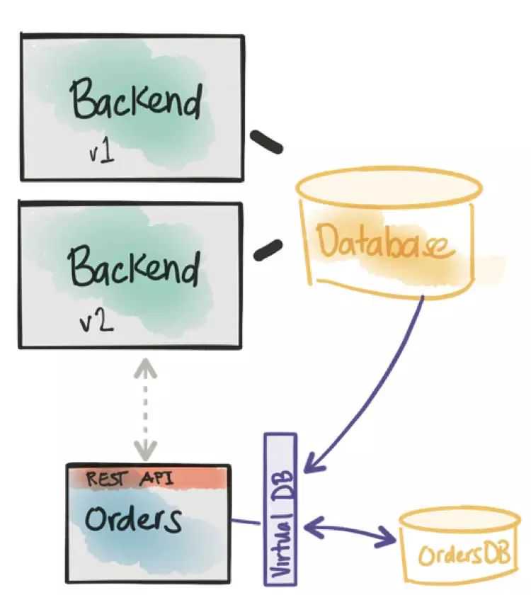 在分解的这个节点上,理应有一个配合着合适的API,域模型和连接到我们自身数据库的Orders服务实施,并暂时创建一个虚拟映射到我们的单体数据库,以便在域模型中使用该数据库。接下来,我们需要将它部署到生产中,进行灰度上线。