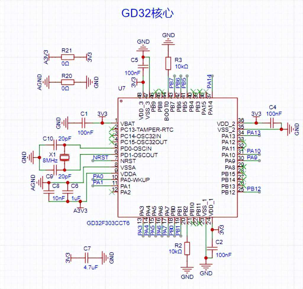 主控一般也是按照数据手册设计即可,额外增加了外部晶振,让定时更精确。