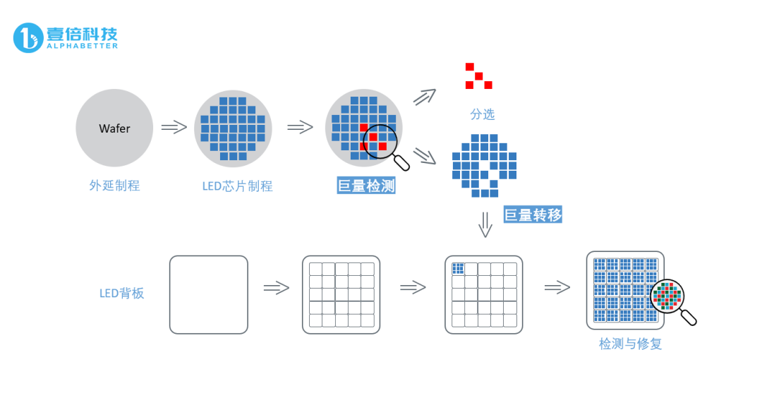 MicroLED晶粒的尺寸在50μm以下,相比传统LED和MiniLED,每一片晶圆上的晶粒数量会呈几何级数增加达到数百万颗,甚至千万颗以上。如何针对MicroLED晶圆级工艺制程生产环节中的全检,以降低后续巨量转移、修复的成本、提升芯片良率,成为产业亟待解决的瓶颈环节。