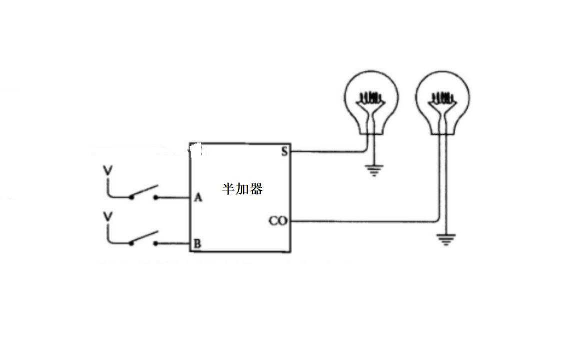 如果我们把半加器接入电路,两个开关表示加数与被加数,加和输出与进位输出都接上灯泡,两个灯泡的点亮和熄灭就表示加数之和,验证一下四个基本的二进制加法。