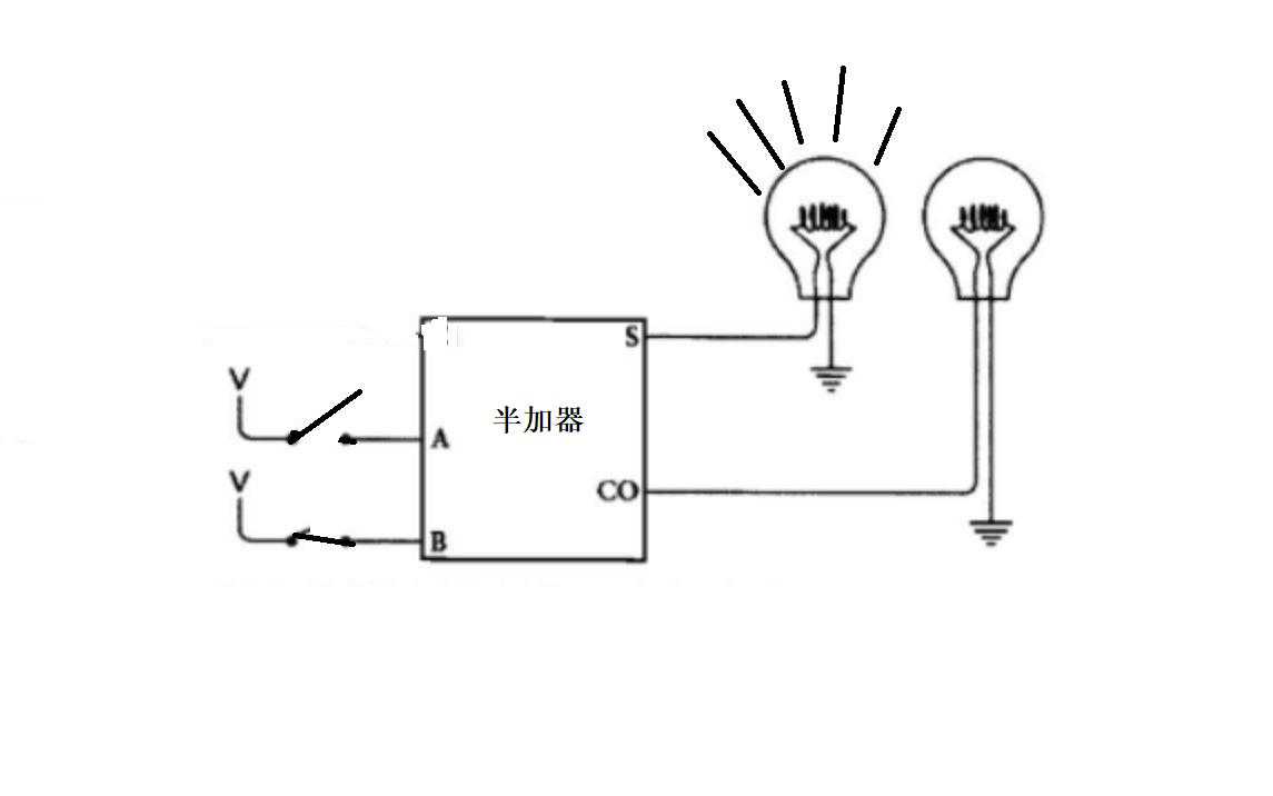 当其中一个开关闭合,加和输出位的灯泡都会点亮,这就是1+0=1,0+1=1的情况。