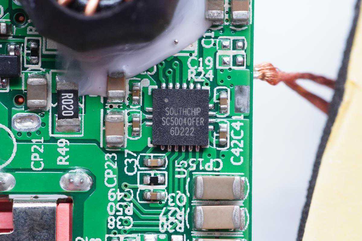 PCB板正面一览,设有移动电源主控芯片、无线充芯片、电容和电感等器件,电容和电感还打胶加固。
