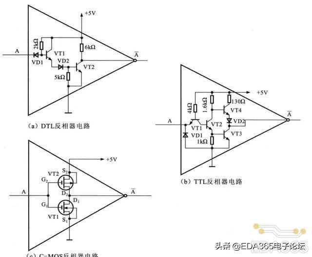 上图中,A为输入变量,Y为输出变量,利用晶体三极管的反相放大特性,当A为低电平,三极管截止,输出端Y为高电平。当输入高电平,三极管处于饱和区,输出端Y为低电平。