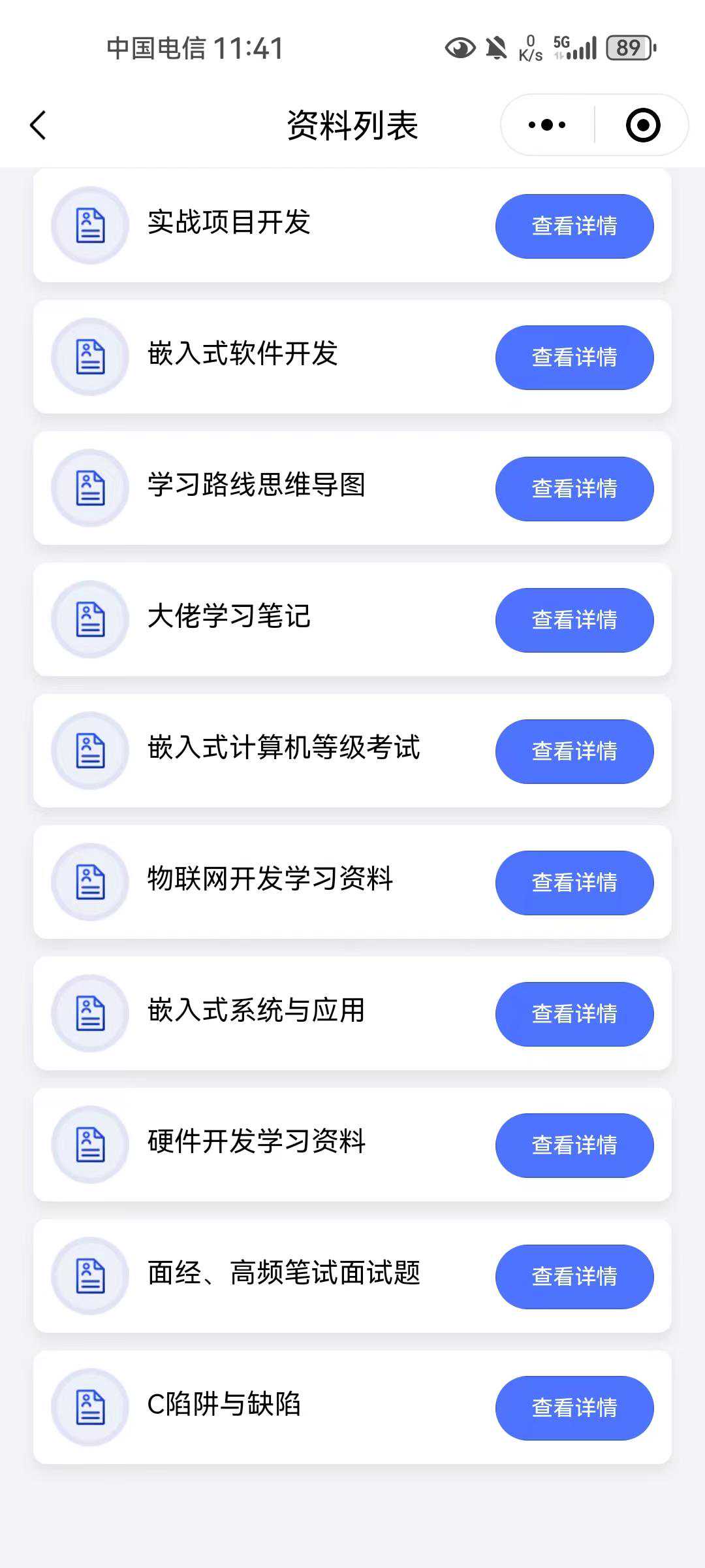 不知道嵌入式如何学习?不清楚嵌入式究竟是何方神圣?遇到问题无人可问?来我的绿泡泡交流群吧!我这里不仅仅有嵌入式相关书籍的电子版本,更是有丰富的嵌入式学习资料,100Gstm32综合项目实战提升包,70G全网最全嵌入式物联网资料包,嵌入式面试、笔试的资料,物联网操作系统FreeRTOS课件源码!群内高手云集,各位大佬能够为您排忧解难,让您在学习的过程中如虎添翼!扫码进群即可拥有这一切!还在等什么?赶快拿起手机,加入群聊吧!二维码详情
