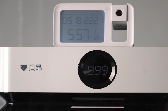 接下来就到号称是无耗材的贝昂空气净化器,永久不用更换耗材,这款净化器的块头比较大搬上桌面还有点费劲;等玻璃罩里浓烟越来越多,贝昂自带检测的显示数值也在一直上升最大值999后开启净化器,不一会儿数值也慢慢下来了。