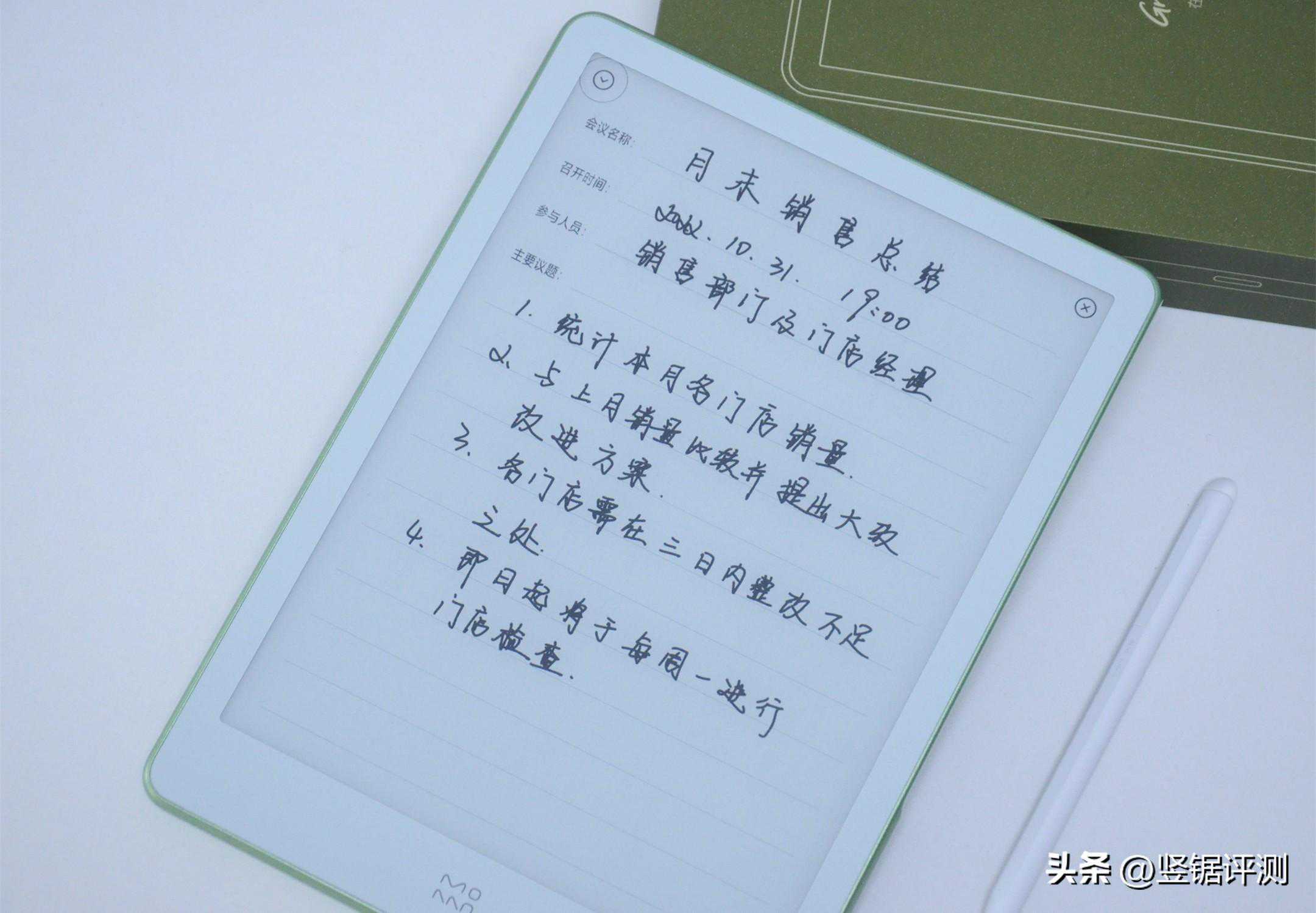 墨案W8的手写效果实拍,笔记功能里还内置了各类预设背景模板,例如:有用于练字的米字格、五线谱以及上图的会议纪要等等。
