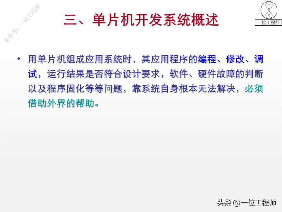 用单片机组成应用系统时,其应用程序的编程、修改、调试,运行结果是否符合设计要求,软件、硬件故障的判断以及程序固化等等问题,靠系统自身根本无法解决,必须借助外界的帮助。