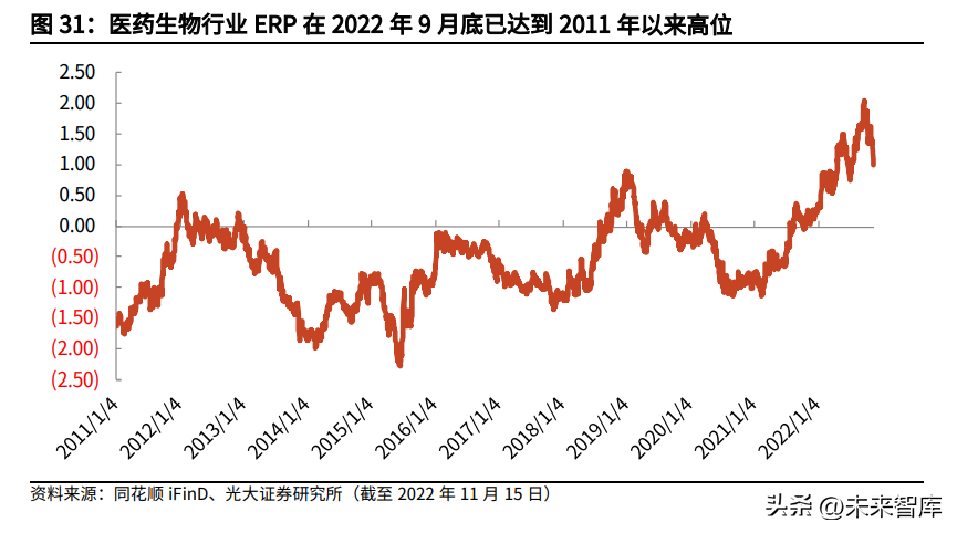 随着新的政策框架不断落地,行业的发展环境发生剧烈变革,同质化内卷走向尾声,终端竞争将走向以临床价值决胜,高临床价值药物将获得更好的商业环境。市场风险偏好低,优质资产迎来布局窗口。医药生物行业的股权风险溢价(ERP)自2021年初以来持续上升,截至2022年9月底已经达到2011年来历史高位,意味着市场对医药的风险偏好持续降低至历史最低值。很多优质创新药资产的估值处于较低位置,迎来布局窗口。当市场风险偏好开始转向上升时,资金可能更乐于流向风险和潜在收益都较高的创新药板块,带来较好的创新药股价表现。