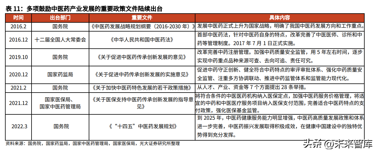 发展中医药已上升为国家战略,政策推动中医药产业高质量发展。十八大以来党中央、国务院高度重视中医药产业发展,出台多项鼓励政策。2016年2月《中医药发展战略规划纲要(2016-2030年)》的出台,标志着发展中医药正式上升为国家战略。此后,陆续出台《中医药法》和促进传承创新发展的意见和政策措施,并于2021年底推出重磅医保支持政策。各项政策稳步推进和执行,中医药事业蓬勃发展。随着行业标准、机制体制和服务体系的建立完善,中医药行业呈现出中西医并重、扶持与规范并举、传承与创新并进的良好局面,行业步入高质量发展阶段。