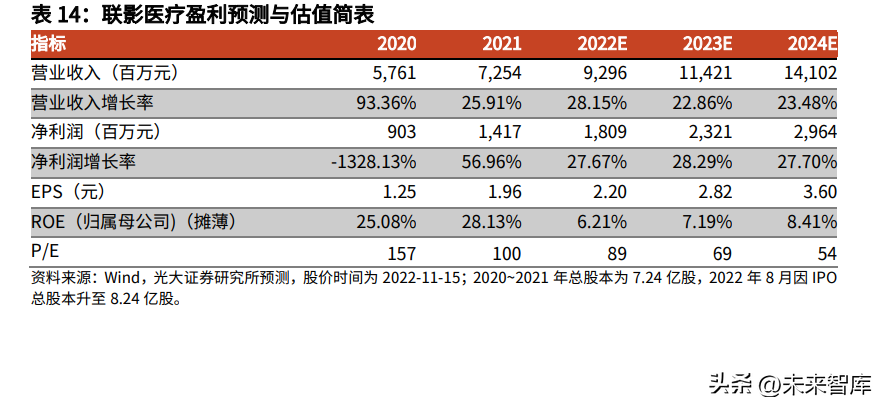 国产医学影像设备龙头企业,深耕行业十余载。联影医疗成立于2011年,致力于为全球客户提供高性能医学影像设备、放射治疗产品、生命科学仪器及医疗数字化、智能化解决方案。深耕行业十余载,联影医疗已经构建起全面完善的医学影像设备产品线,公司持续投入研发,核心技术逐渐走向全球行业前沿水平。公司核心管理团队具备丰富行业经验和技术底蕴,员工持股平台合计持有8.56%股权,激励充分。公司2022年前三季度营业收入58.59亿元,同比增长25.55%,归母净利润8.99亿元,同比增长16.62%,扣非归母净利润7.20亿元,同比增长15.51%。政策扶持+技术突破,千亿医学影像设备行业格局正被撬动。医学影像设备根据信号的不同大致可分为磁共振成像(MR)、X射线计算机断层扫描成像(CT)、X射线成像(XR)、分子影像(MI)等。全球医学影像设备行业2020年市场规模约430亿美元、我国约537亿元(预计到2030年市场规模有望接近1100亿元),但我国CT、MR、PET/CT等影像设备人均保有量仅为发达国家的1/10~1/3,普及率处于较低水平。此外国内市场也呈现出行业集中度低、企业规模偏小、中高端市场国产产品占有率低的局面。近年来,伴随国产医疗设备整体研发水平的进步,产品核心技术被逐步攻克、产品品质与口碑崛起,部分国产企业已通过技术创新实现弯道超车,进口垄断的格局正在发生变化,叠加政策扶持,千亿医学影像设备行业格局正在被联影医疗等国产龙头企业撬动。