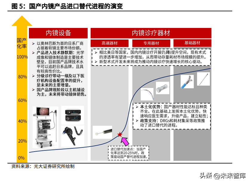 国产品牌进入重大战略机遇期,进口替代进程加快。以内镜设备为例,内镜设备处在替代早期,部分诊疗器材进入加速替代期。内镜设备:当前市场呈现寡头垄断的格局(奥林巴斯占据八成以上的市场份额),但是内镜的核心技术(光学成像和晶体制造)的技术迭代较慢,产品进入技术静默期,与此同时国产品牌已经在关键技术领域实现突破,从而具备了进口替代的基础。受益于一级及以下医疗机构内镜配置率的提升,国产品牌抓住增量市场,开始进行主机铺设,未来将带动镜体的销售。内镜诊疗器材:国产品牌性能达标,可发挥本土化优势快速响应医生需求,迭代产品;同时在DRGs和集采等政策下,高性价比的国产器材优势巨大。我们认为国产诊疗器材有望率先实现进口替代,部分国产产品进入了加速替代期。随着国产品牌技术实力不断提升,国产创新器械进口替代空间有望不断提升,最终实现进口替代。