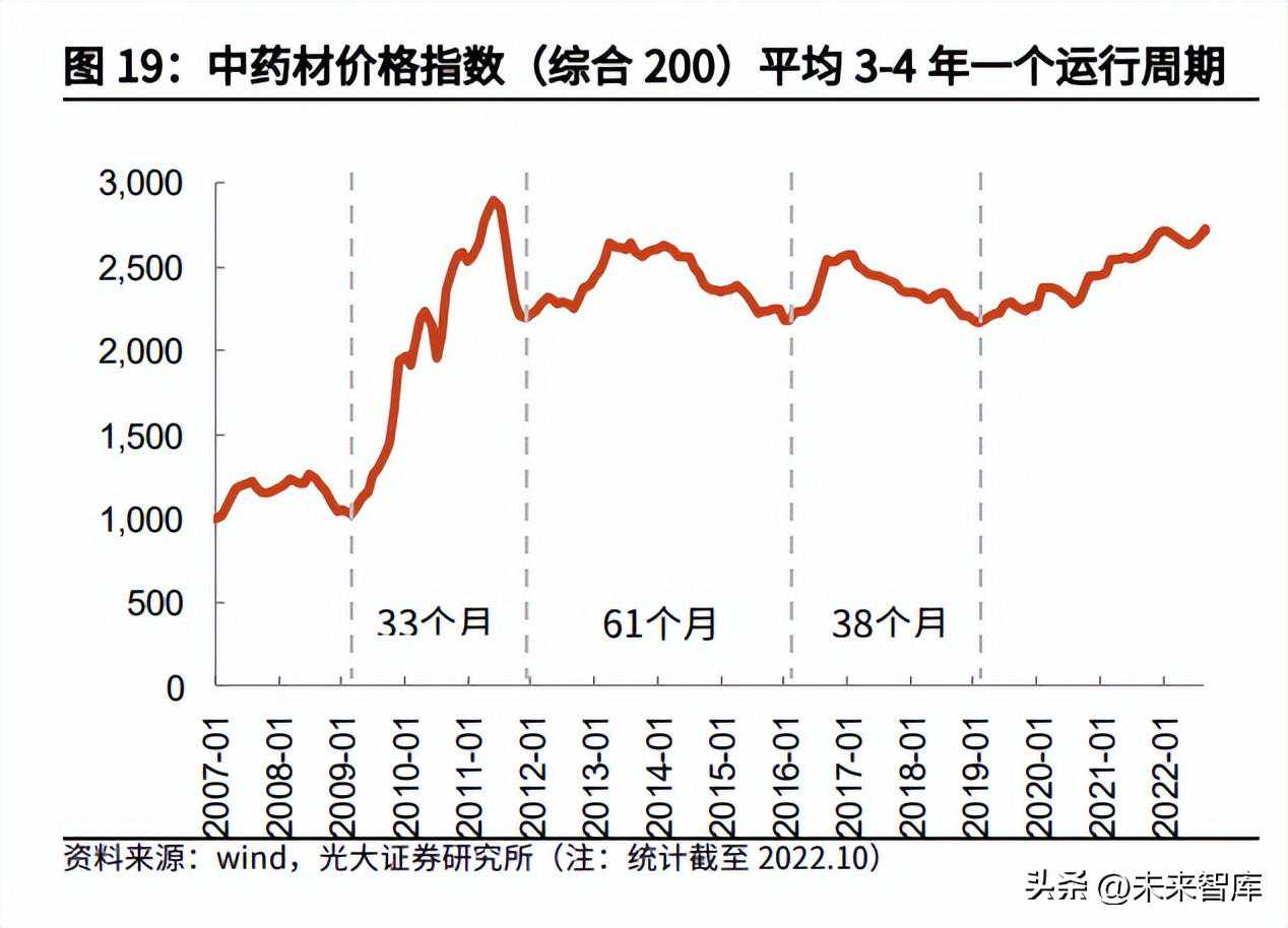 异常天气增多和新版药典执行加速供给收缩,在政策鼓励需求扩容下,本轮中药材涨价周期有望延长至2023年下半年。中药材原料属于大宗农副产品,受到近年来极端天气增多的影响,价格波动加大。参照中药材价格指数(综合200),2007年以来中药材价格平均3-4年一个运行周期。最近的一次低点是2019年初,至今高景气周期持续接近3年。而由于新版中国药典的药品质量标准大幅提高,入药品种、部位和达标基地供给减少,中药材价格加速上涨。此外,2019年国务院出台《关于促进中医药传承创新发展的意见》,大力健全中医药服务体系并推广中医诊疗,并于2021年底推出重磅医保支持政策。我们判断本轮中药材景气周期有望延长,拐点可能会在2023年下半年。