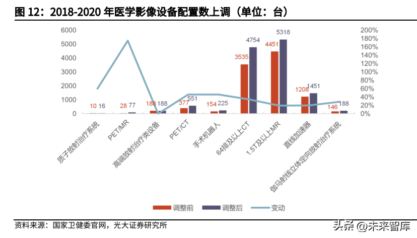 2)医学影像设备配置证审批放松,国内企业迎来行业春风。2020年卫健委发布了《关于调整2018-2020年大型医用设备配置规划的通知》,大型医用设备配置规划数量有不同程度的上调。甲乙类大型医用设备规划共增加2671台,其中甲类大型医用设备配置规划增加55台,乙类大型医用设备配置规划增加2616台。国内企业研发的持续投入,医疗器械需求的增加,以及医学影像配置证放开,或驱动国内企业加速发展。