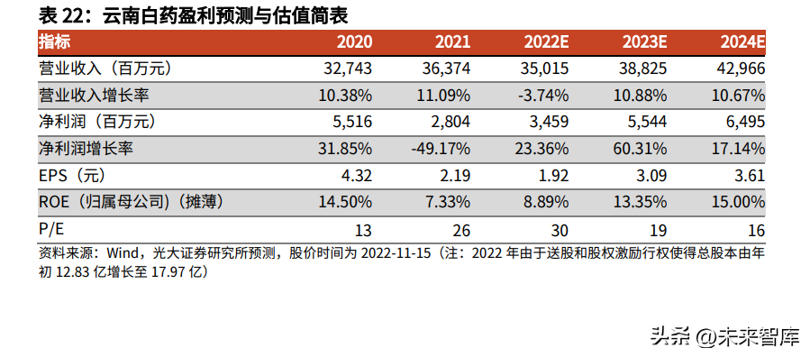 新业务加速落地,上海医药战略合作正式开启。公司持续推进“1+4”的第二增长曲线战略落地,聚焦中医药、口腔护理、皮肤科学、骨伤科、女性关怀等赛道。9月底首家医美门诊部在上海开业,正式切入医美赛道,未来将在北京、上海、昆明等地加速开店,深入布局产业链上下游。2022年重磅上线“齿说”(ToothTalk)口腔科学专研品牌,全新打造口腔智护解决方案,产品包括:智能电动牙刷、冲牙器、漱口水、口喷、耗材和小程序服务平台等,有望成为新的增长点。2022年8月底上海医药董事会提名董明和陈发树先生为董事会董事,提名马加先生为监事会监事,云南白药将深度参与上海医药公司治理与运营,充分整合双方平台和资源优势,进一步提升企业核心竞争力和盈利水平。以用户为中心,持续推进数字化转型。公司持续推进数字化转型,对内推动企业管理和组织变革,从面向功能的流程转变为面向打通客户场景的流程,建立统一的“数据底座”和治理策略,构建以数据为基础,“基于事实”的智能决策系统。对外以用户数据中台为核心,搭建“以用户为中心”的商业体系,提升客户体验。此外,云南白药《数字三七产业平台—赋能百年中药启航工业4.0时代》入选中国上市公司协会数字化转型优秀案例。2022年7月,公司与华为签署了《人工智能药物研发全面合作协议》,双方将在人工智能药物研发领域,开展广泛的交流和合作,探索联合科研创新的机制,扩大双方合作的广度和深度,包括但不限于大小分子设计、相关病症、数据库开发等。