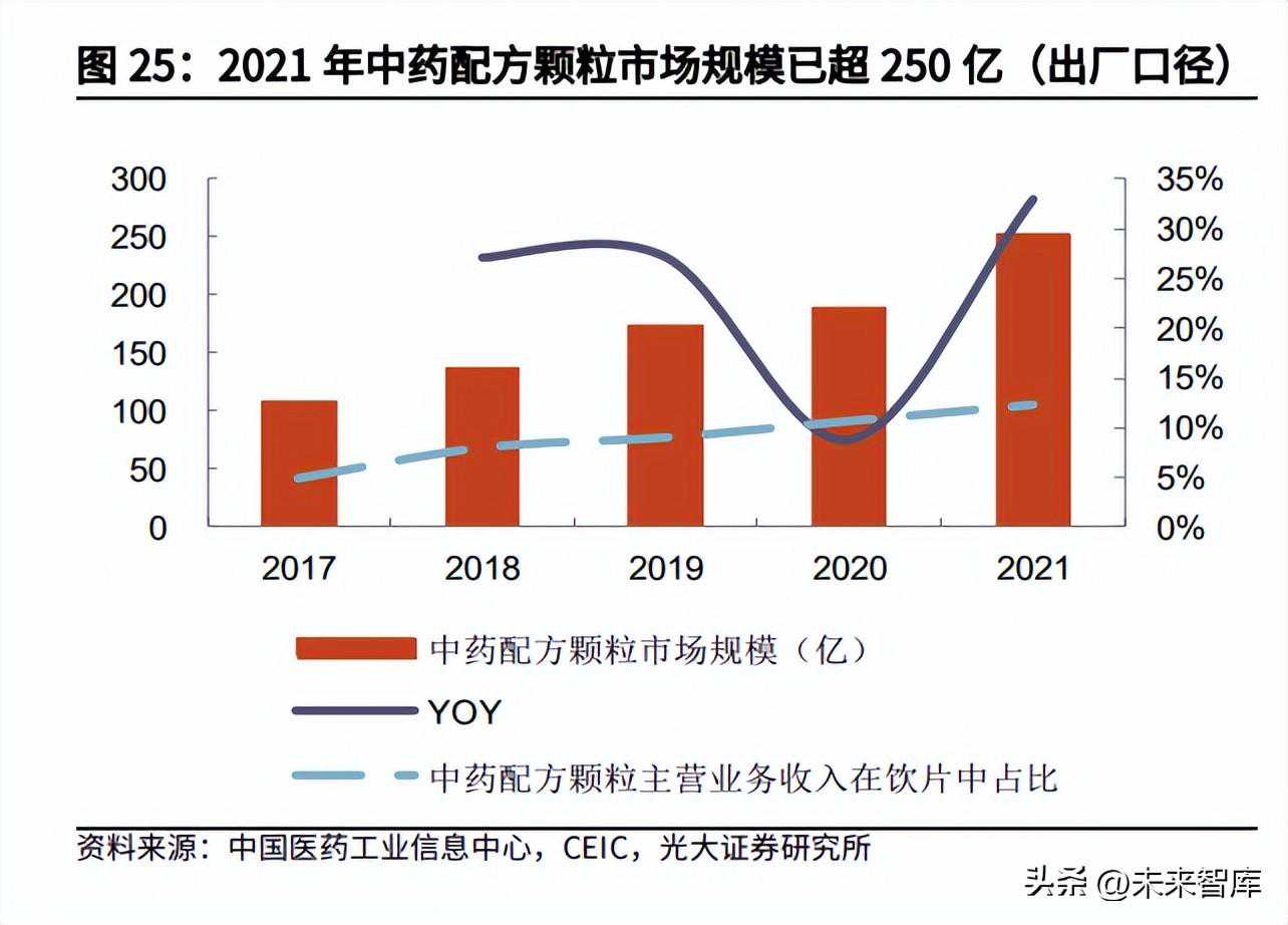 告别国标切换阵痛期,2023年有望迎来量价齐升。2022年上半年行业处在国标切换期,医疗终端仍在消化上年的企标产品库存,且由于各省政策存在差异,配方颗粒省标及国标备案的推进速度较慢,导致头部企业的相关业务收入出现短暂下滑。我们预计以上不利因素在2022年年底前将全部消除,行业有望于2023年迎来量价齐升。截至2022年10月,国家药监局已公布200个中药配方颗粒国标品种,此外有69个品种处于公示期。新国标的实施将推动生产成本大幅上涨,同时随着上游中药材的持续涨价,2022年行业迎来较大幅度提价。行业提价叠加市场扩容,我们估计行业放量将在2-3年内达到相对稳定状态,届时中药配方颗粒使用量占中药饮片的比例有望从约12%提升到20-30%,暂不考虑行业集采,假设中药饮片市场规模保持稳定,我们预计整体中药配方颗粒市场规模在2025年将达到530-920亿元,较2021年有1-2.5倍的增长空间。