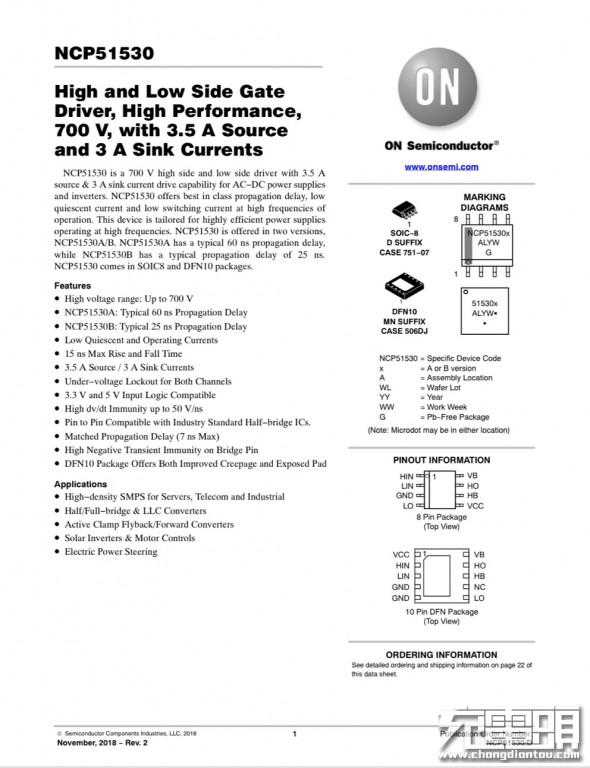 安森美NCP51530是一款700V高压侧和低压侧驱动器,具有3.5A电源和3A汇极电流驱动能力,适用于交直流电源和逆变器。NCP51530在高频工作时提供最佳的传输延迟、低静态电流和低开关电流,该芯片专为高频工作的高效电源而设计。NCP51530有两个版本,NCP51530A/B。NCP51530A具有典型的60ns传播延迟,而NCP51530B具有典型的25ns传播延迟。NCP51530采用SOIC8和DFN10封装。