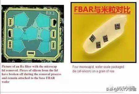 图示为若干FBAR连接起来形成滤波器。右图为封装好后的FBAR滤波器芯片及米粒对比,该滤波器比米粒还要小上许多。