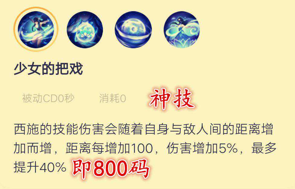 效果:西施与敌人的距离每增加100,技能伤害增加5%,最多提升至40%