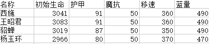 属性分析四大美女集团的属性在王者荣耀的法师中属于反向吃鸡的位置,若单把四大美女的初始属性拿出来对比的话,我们又会发现西施的各项指标在其中都不算突出:基础生命值仅有3041点,位列法师末尾(平均3200血);初始护甲尚可,高达91点;移动速度仅有360,位列倒数第二梯队;初始蓝量490,仅仅达到法师平均水平