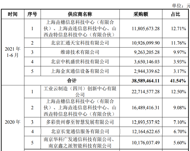 而从采购商来看,鼎欣软件2020年的前五大采购商出现了不少新面孔,其中第四大采购商北京长宽通信服务有限公司成立于2019年5月(据天眼查),第三大采购商多彩贵州睿至智慧发展有限公司成立于2019年6月(据天眼查),即这两家企业均在成立第二年就成为了公司的重要供应商。