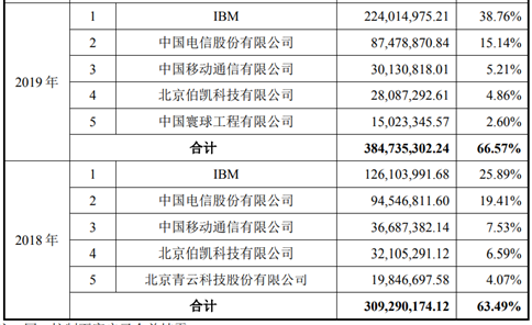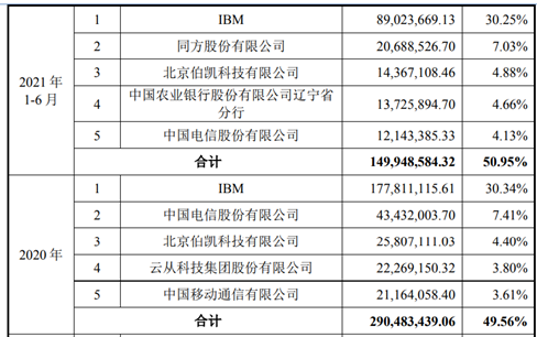 报告期内,公司前五大客户销售金额占主营业务收入的比例分别为63.49%、66.57%、49.56%、50.95%,占比超过五成。公司向IBM销售金额占主营业务收入的比例分别为25.89%、38.76%、30.34%及30.25%,超过三成。