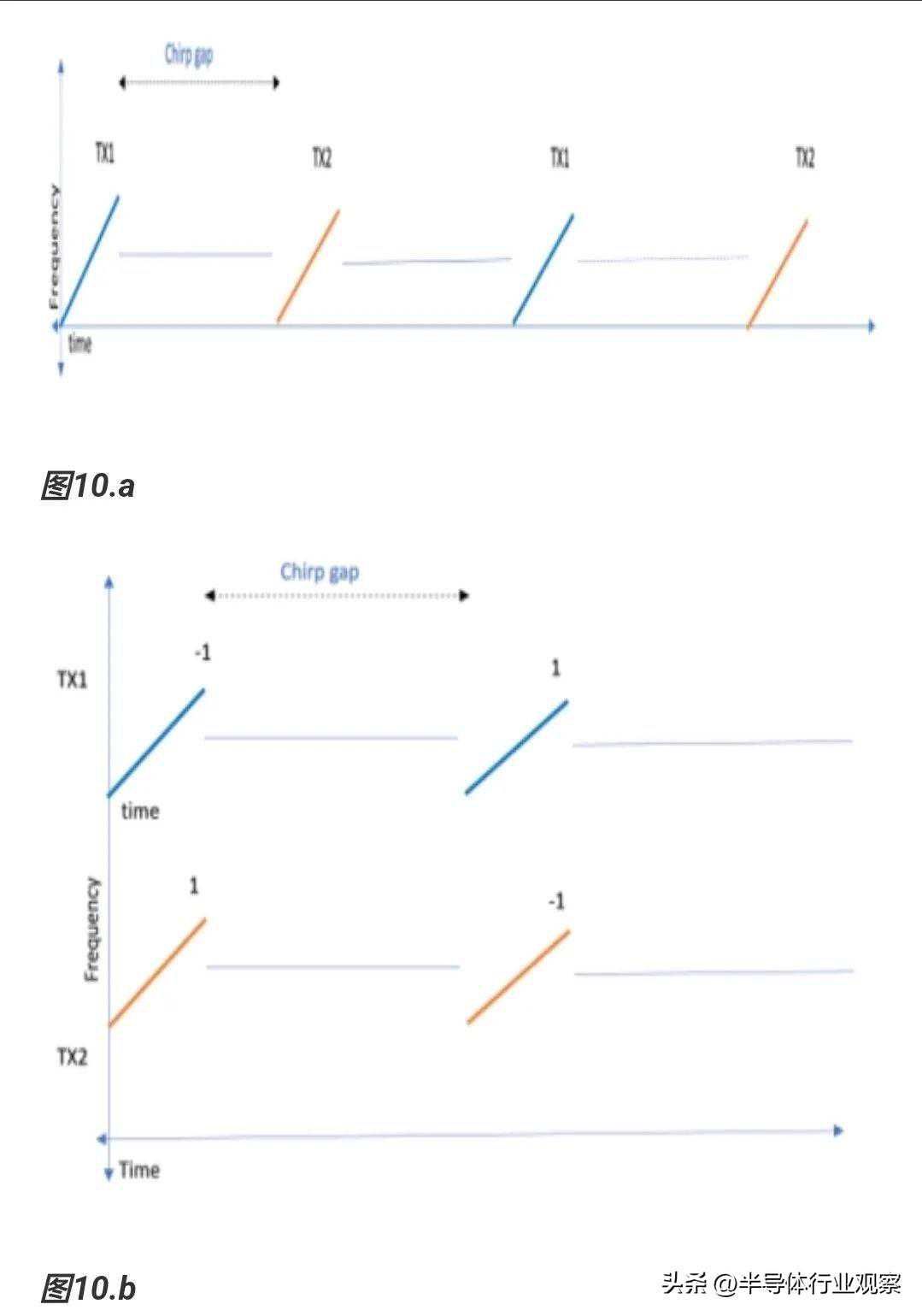 在MIMO中,TX中的线性调频脉冲传输通常采用不同的方法。其中一种方法是TDM(时分复用)。在此,连续的多个线性调频脉冲被发送,但这些线性调频脉冲是时间共享的,被一一分配给每个TX(参见图9.a)。这种方法更容易实现,但没有充分利用传感器的能力,并且功耗较低。其他方法涉及BPSK或二进制相移。这里有两个TX,如图10.b所示。同时传输,但保持180度相对相移。考虑+1chirp-1chirp或空间分离的chirp。这可以提高传感器的利用率,但对于某些应用,它会增加功耗。