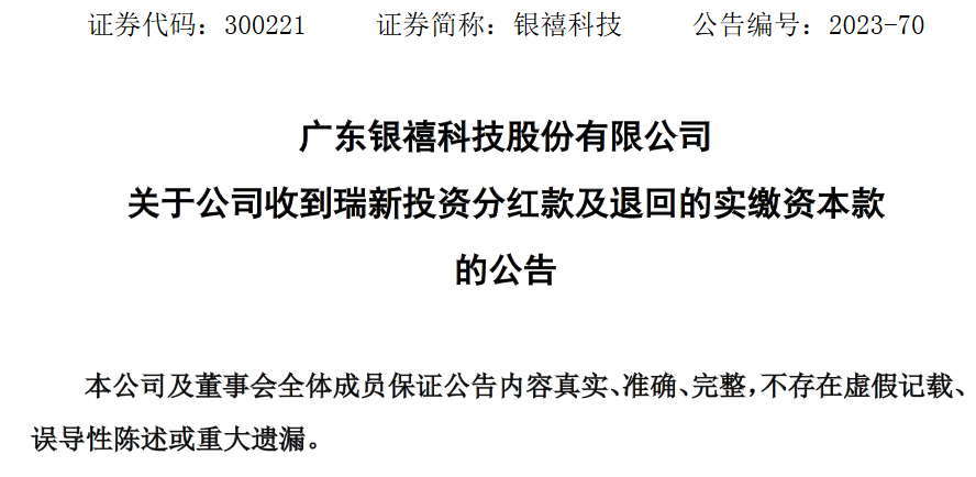银禧科技持有瑞新投资30%股份,因此银禧科技本次收到瑞新投资退回的实缴资本款693万元以及瑞新投资的现金分红款215.10万元。