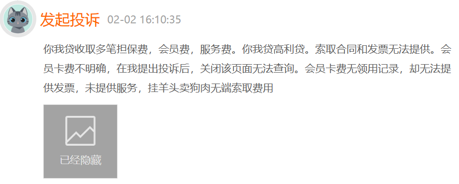 贝多财经注意到,有用户在黑猫投诉上反映称,你我贷平台借款时必须开通会员,且会员卡费不明确。在收取了多笔担保费、会员费和服务费的情况下,平台却无法向用户合同和发票,涉嫌无端索取不合理费用,侵害消费者权益。