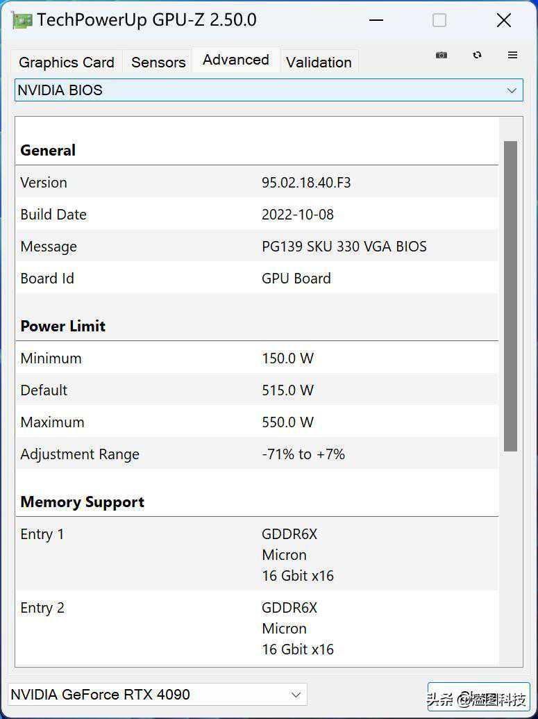 GPU-Z信息,可以看到七彩虹RTX4090战斧豪华版完全采用公版频率,BIOS内默认的功率上限是450W,最大可以设置为480W。
