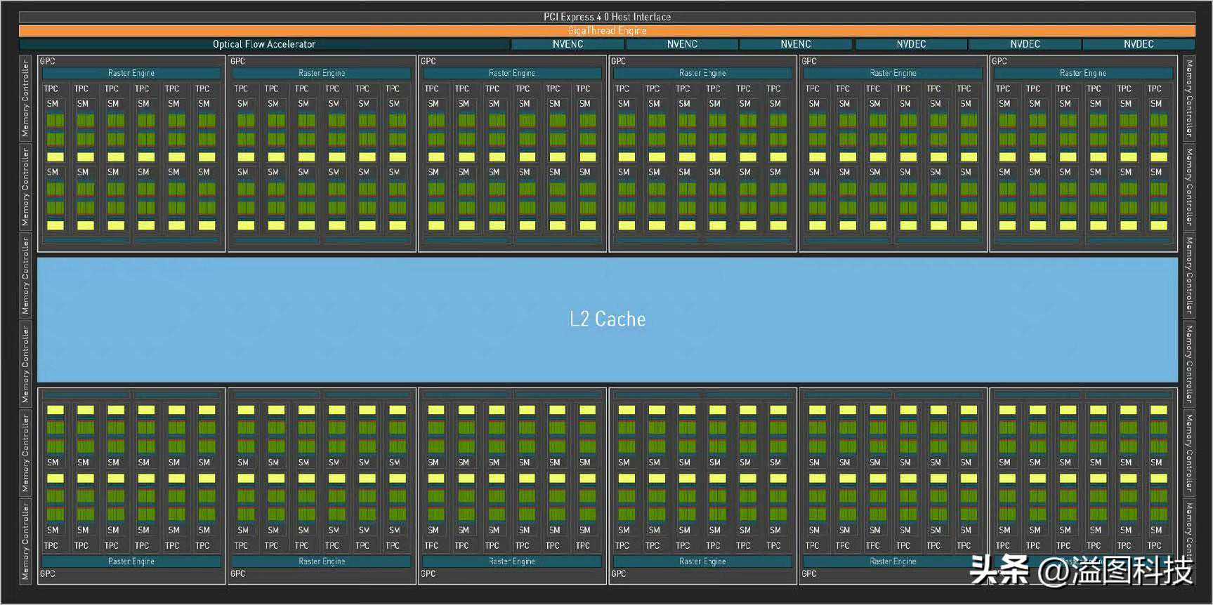 上面一行不起眼的独立单元也是这次AdaLovelace的重要升级,包括了全新的硬件光流加速器、完整支持AV1编解码的NVENC/NVDEC。比较可惜的是PCIe接口仍然是4.0规格,想用到的话,还是要等下一代了——不过应该对性能没什么大影响,反正这代也不支持SLI了,不用考虑拆分x8的问题,的带宽完全足够。