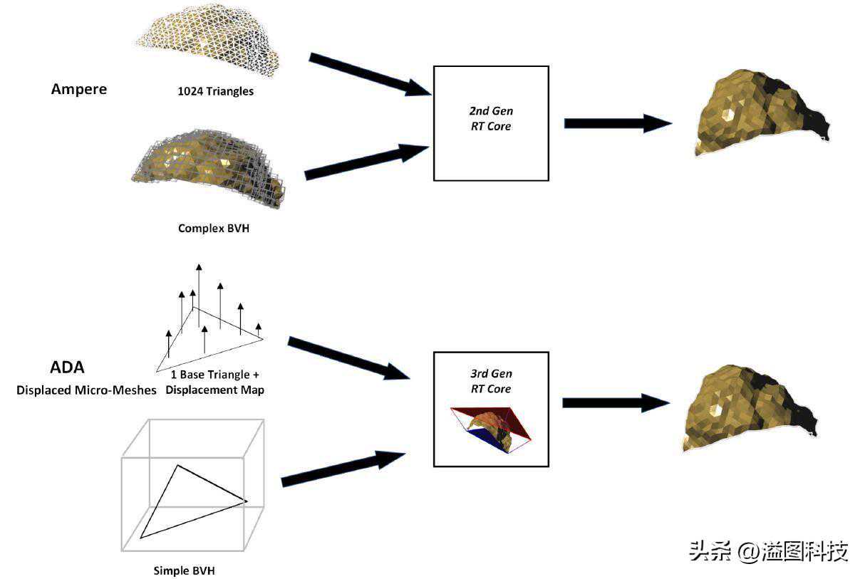 DX11当中引入曲面细分之后,描绘物体表面凹凸使用的三角形数目大幅度增加,而对于光追来说这些三角形大部分都是不必要的——人们对于光照特效的感知远没有那么细,对于一个物体来说用一个大三角形把它包络进去进行光追计算,得到的结果也一样可以令人满意。