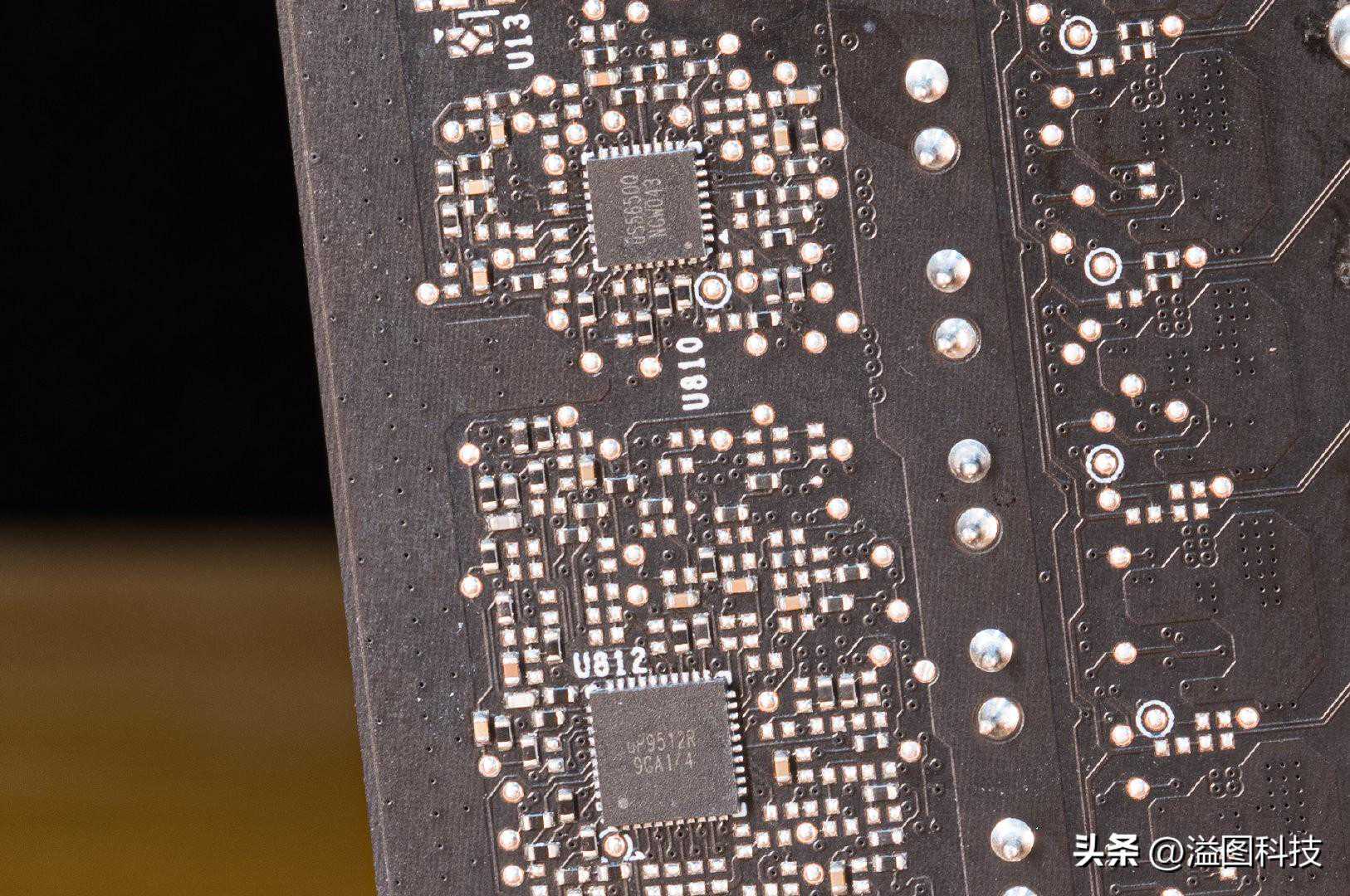 PWMController为两颗uP9512+一颗uS5650,由于两颗uP9512仅能支持16相供电,所以24路核心供电当中应该有16路采用了8×2并联设计,另外8路是独立的8相。