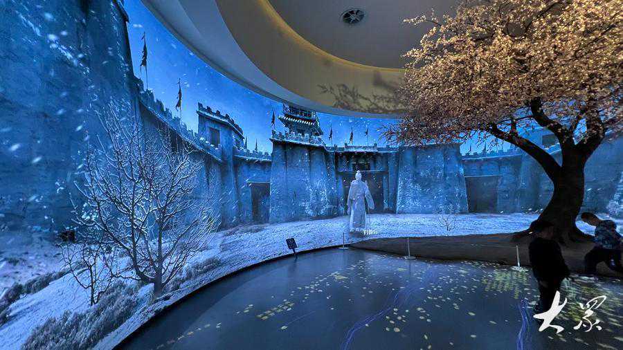 在“秦汉隋唐”展厅,设计者以孔子为主题,打造了一个独具特色的沉浸式影院。影片以真人演绎与动画相结合的形式,生动再现了孔子“再逐于鲁,削迹于卫,伐树于宋,穷于商周,围于陈蔡……”的传奇一生。观众不仅可以跟随影片,重温“有教无类”“问礼老聃”等经典故事;更可以身处实体再现的杏坛讲学场景,感受大思想家的穿越千年的智慧。灯光打在地板上,呈现出杏花飘落的景象时,行人走过,落花化作一句句《论语》名句,每一步都仿佛踏在历史的长河中,与先贤产生了一种奇妙的联结。