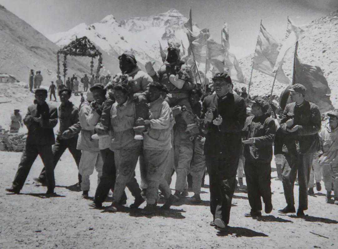 1960年5月30日,王富洲等3人回到大本营受到热烈欢迎。