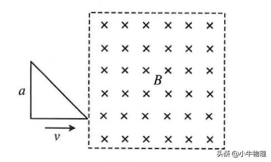 一金属导线单位长度的电阻为ρ,折成等腰直角三角形,直角边长为a,在t=0时刻从图示位置开始以速度v匀速进入以B=B₀-kt规律变化的均匀磁场中,其中k为大于零的常数。当三角形的水平直角边进入一半时,求: