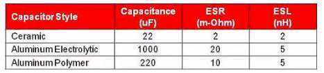 电源纹波和瞬态规格会决定所需电容器的大小,同时也会限制电容器的寄生组成设置。图1显示一个电容器的基本寄生组成,其由等效串联电阻(ESR)和等效串联电感(ESL)组成,并且以曲线图呈现出三种电容器(陶瓷电容器、铝质电解电容器和铝聚合物电容器)的阻抗与频率之间的关系。表1显示了用于生成这些曲线的各个值。这些值为低压(1V~2.5V)、中等强度电流(5A)同步降压电源的典型值。
