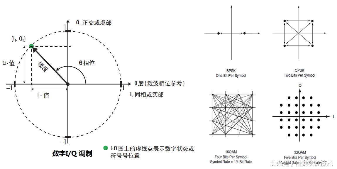 对于数字调制来说,采用的是离散的数字量来控制载波相位和幅度的变化,因此其在极坐标上的状态表示为一个个离散的点,这些点根据不同的调制方式而组成不同的图案,这些图案有时又称为星座图(Constellation)。