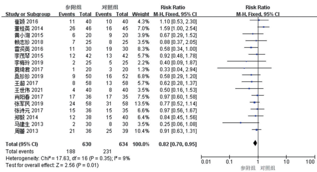 17篇RCTs比较了参附组和对照组脓毒性休克患者治疗后28d病死率的差异,包括参附组和对照组各650例(图3)。研究资料具有同质性(P=0.35,图2偏倚风险评估图=9%),故采用固定效应模型。结果显示两组间差异有统计学意义(RR=0.82,95%CI为0.70~0.95,P=0.01),表明常规西医疗法联合参附注射液治疗能降低脓毒性休克患者28d病死率。漏斗图分布不均,0.05,提示可能存在发表偏倚(图4(a))。