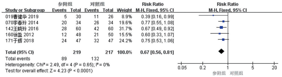 5篇RCTs比较了参附组和对照组脓毒性休克患者治疗后MODS发生率的差异,包括参附组219例,对照组217例(图5),研究资料具有同质性(P=0.65,=0%),固定效应模型荟萃结果显示参附组与对照组组间差异有统计学意义(RR=0.67,95%CI为0.56~0.81,),表明常规西医疗法联合参附注射液治疗能降低脓毒性休克患者MODS发生率。漏斗图分布较均匀,=0.062,提示存在发表偏倚的可能性较小(图4(b))。