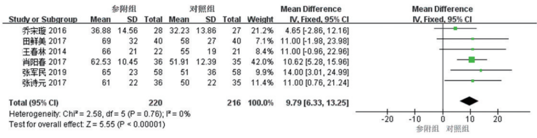 6篇RCTs比较了参附组和对照组脓毒性休克患者治疗后24h血乳酸清除率的差异,包括参附组220例,对照组216例(图9),研究资料具有同质性(P=0.76,=0%),采用随机效应模型。结果显示两组间差异有统计学意义(MD=9.79,95%CI为6.33~13.25,),表明常规西医疗法联合参附注射液治疗能显著提高脓毒性休克患者治疗后24h血乳酸清除率。漏斗图分布不均,0.05,提示可能存在发表偏倚(图4(f))。