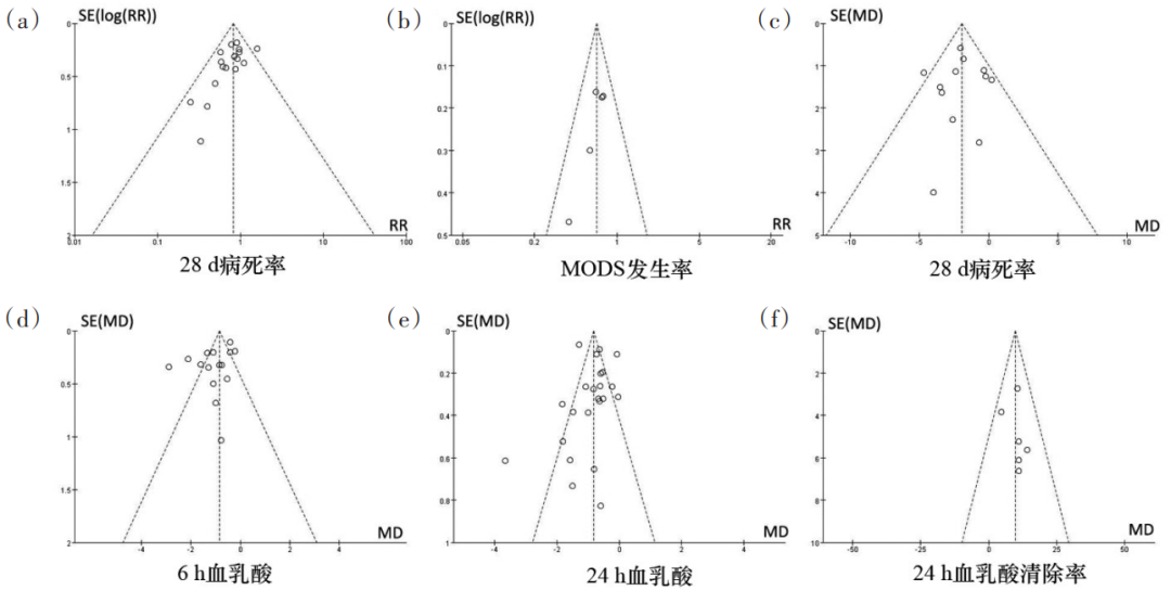 图4病死率、MODS发生率、血乳酸和清除率指标发表偏倚漏斗图