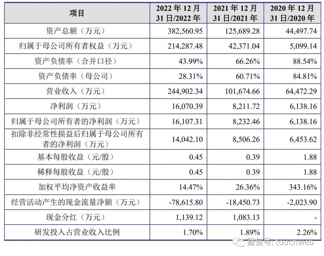 招股书显示,祥邦科技2020年、2021年、2022年营收分别为6.45亿元、10.17亿元、24.49亿元;净利分别为6138万元、8211.7万元、1.6亿元;扣非后净利分别为6453.6万元、8506万元、1.4亿元。