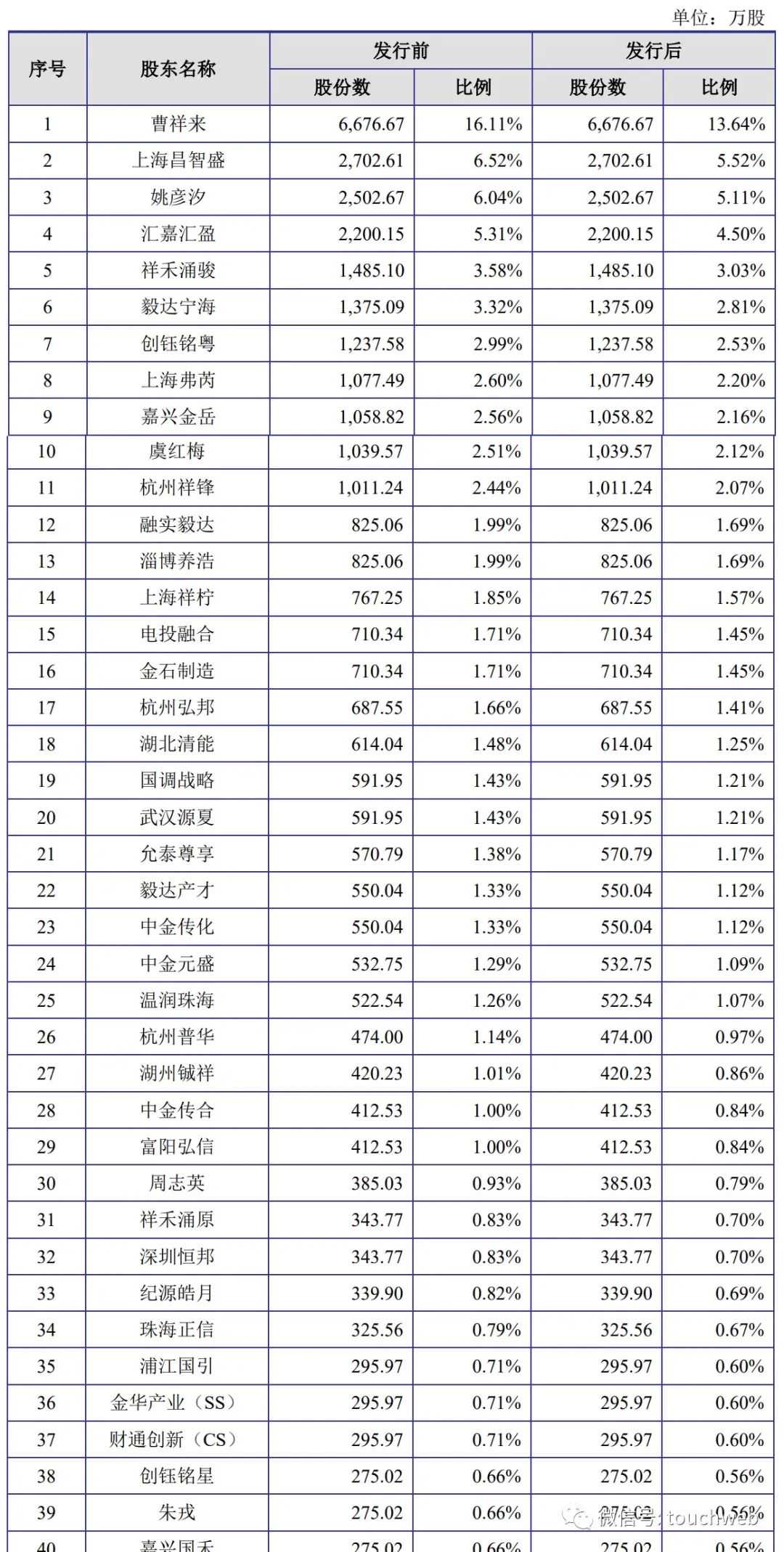IPO后,曹祥来持股为13.64%,上海昌智盛持股为5.52%,姚彦汐持股为5.11%,汇嘉汇盈持股为4.5%,祥禾涌骏持股为3.03%,毅达宁海持股为2.81%,创钰铭粤持股为2.53%,上海弗芮持股为2.2%,嘉兴金岳持股为2.16%,虞红梅持股为2.12%,