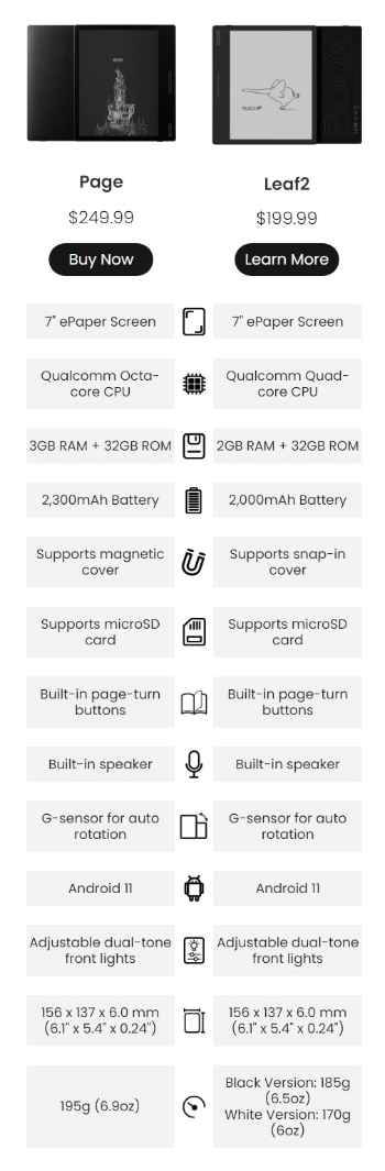 此外,BOOXPage搭载物理翻页键,方便用户读书;内置microSD卡插槽、扬声器、麦克风、重力传感器;拥有2300mAh锂电池,USB-C接口,重量195克,尺寸156毫米。
