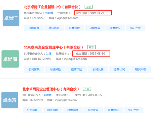 但有意思的是,工商资料显示,卓尚湾、卓尚海、卓尚江三家公司的成立日期均晚于2019年8月15日,其中卓尚湾、卓尚江成立于2019年8月27日,卓尚海成立于2019年8月30日。