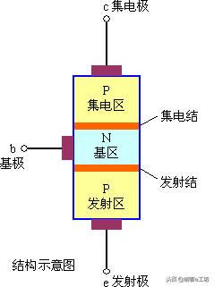 从这三个区域引出电极,于是就有了基极b,发射极e,集电极c,抽象成图形表示如图所示。